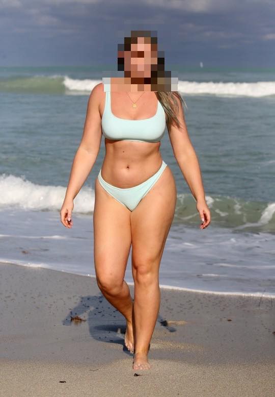 Elle se trouve à la plage. Elle porte un joli maillot bleu de deux pièces. Elle n’a rien de plus, et c’est sans complexe qu’elle prend la pose.
