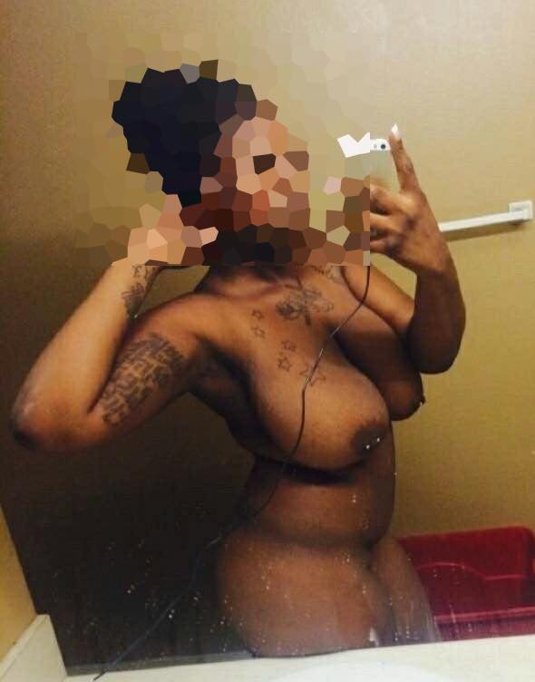 C’est une jolie femme noire. Elle est tatouée. Elle a une forte poitrine, avec des piercings sur les tétons.
