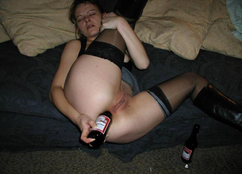 Elle se retrouve rapidement sur le lit. Elle s’allonge, et ouvre ses cuisses. Elle n’a plus son string, et c’est sans complexe qu’elle utilise une bouteille de bière pour se donner du plaisir. Elle l’enfonce dans son anus, gémissant de plaisir.