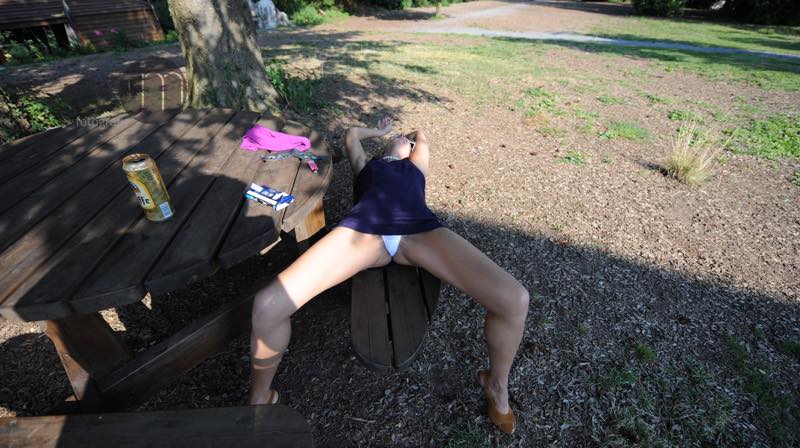 Elle est au grand air, dans la nature. Elle se trouve juste devant une table. Elle s’installe sur un banc en bois. Elle s’allonge dessus, se faisant une joie de nous faire découvrir son corps.