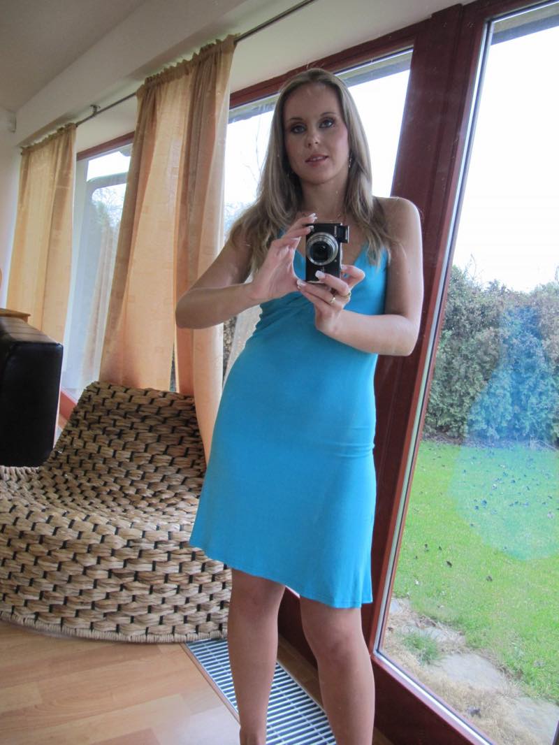 Elle est à la maison. Elle se trouve dans le salon. Elle porte une jolie robe bleue. Elle s’installe debout devant un miroir, et avec son appareil photo, elle se prend en photo, nous faisant découvrir sans aucun complexe son corps.