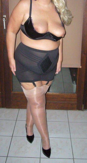 Elle porte un soutien-gorge noir. Elle a une jupe grise, et des jarretelles beiges qui sont accrochées à sa jupe.